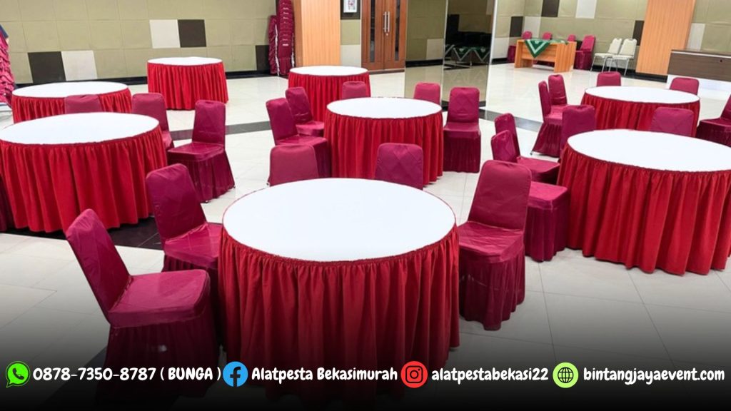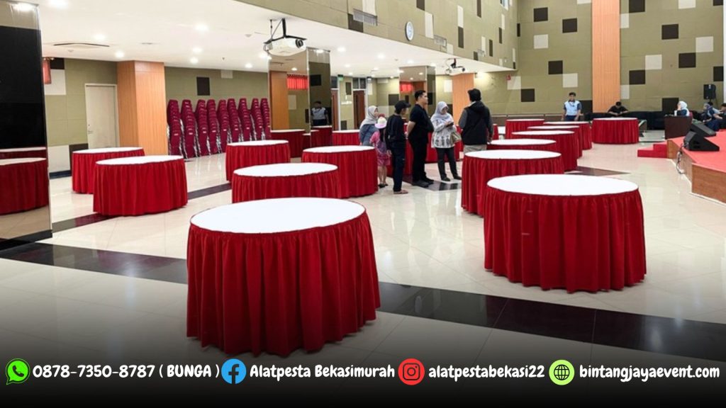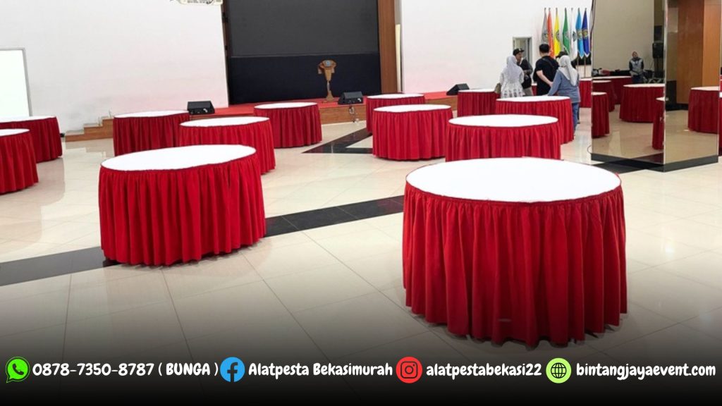 Sewa Meja Bundar Dengan Cover Putih dan Merah Skirting Jakarta