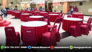 Sewa Meja Bundar Dengan Cover Putih dan Merah Skirting Jakarta (1)